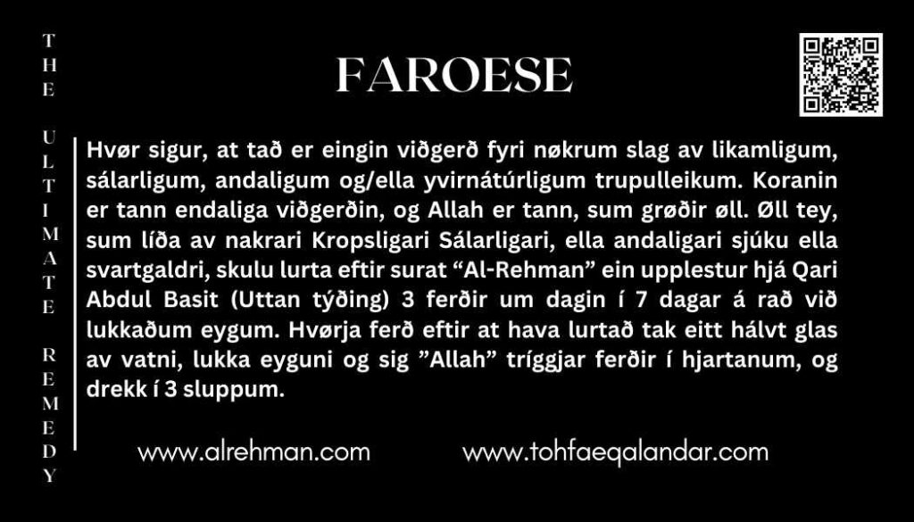 Øll tey, sum líða av nakrari Kropsligari Sálarligari, ella andaligari sjúku ella svartgaldri, skulu lurta eftir surat “Al-Rehman” ein upplestur hjá Qari Abdul Basit (Uttan týðing) 3 ferðir um dagin í 7 dagar á rað við lukkaðum eygum. Hvørja ferð eftir at hava lurtað tak eitt hálvt glas av vatni, lukka eyguni og sig ”Allah” tríggjar ferðir í hjartanum, og drekk í 3 sluppum.